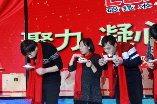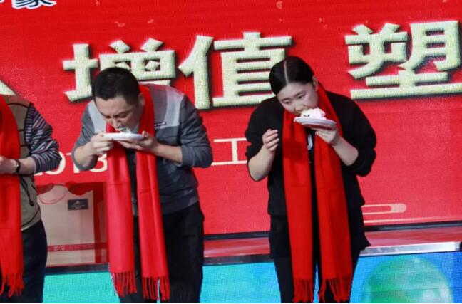 公司貼心的為本命年的60位員工送上紅圍巾,祝福他們在狗年順順利利,紅紅火火。而后別開生面的吃蛋糕比賽,讓會場里笑聲連連。