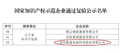 近日,國家知識產權局公布了《2019年度國家知識產權優勢示范企業評審和復驗結果公示》,沈陽隆基電磁科技股份有限公司與鞍山鋼鐵集團有限公司、東軟集團股份有限公司作為遼寧企業,共同通過復驗。