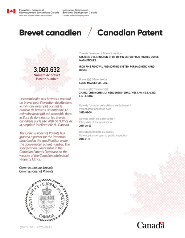 2021年,該設備獲得澳大利亞專利,此次再獲加拿大專利授權,隆基頑石除鐵系統國際化之路越走越寬。