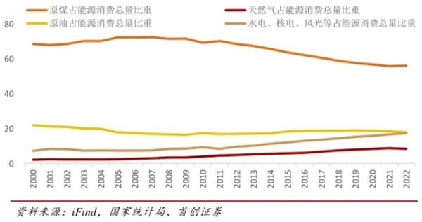 國家統計局數據顯示,2023年中國能源消費總量57.2億噸標準煤,比上年增長5.7%。煤炭消費量占能源消費總量比重為55.3%,天然氣、水電、核電、風電、太陽能發電等清潔能源消費量占能源消費總量比重為26.4%。